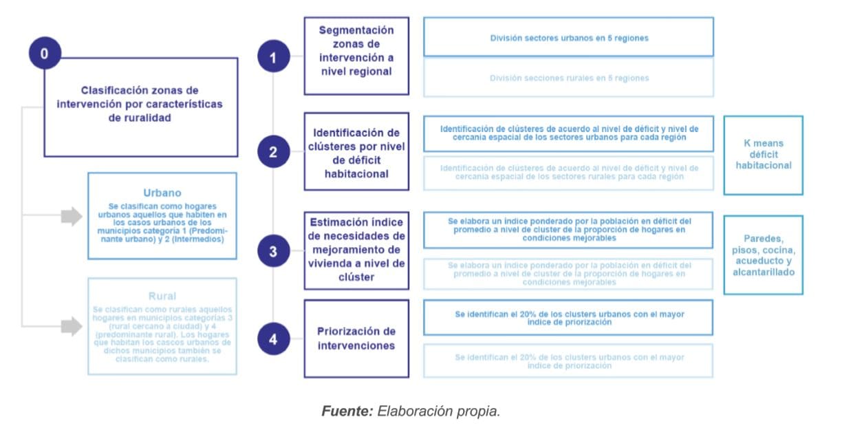 A continuación, se presenta la metodología propuesta para la focalización de intervenciones en zonas urbanas y rurales, basada en el análisis del déficit habitacional y las soluciones de vivienda estudiadas en el documento. Se ha diseñado la siguiente metodología de focalización para identificar las áreas prioritarias de intervención en términos de mejoramiento de viviendas y entornos. La metodología consta de 6 pasos, descritos a continuación e ilustrados en la Figura 29.