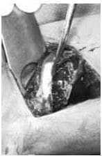 La costilla es cortada a la longitud apropiada in situ una vez haya sido contorneada. La corteza pleural en un extremo de la costilla es completamente removida por una distancia de 2 cm de manera que garantice contacto con la superficie distal del hueso del huésped en la porción distal.