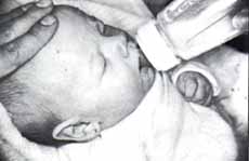 3.2. Niña de 2 meses que desde el segundo día de nacida comenzó con ruidos fuertes durante la alimentación. Su gestación fue normal y nació a término, por cesárea, sin complicaciones. Su estado general es satisfactorio. Al alimentarla con biberón presenta ruidos fácilmente audibles y a la palpación se detectan los ruidos y vibraciones -brincos- a nivel de ATM bilateral y sobre región cervical y frontal. Se diagnostica miodoclo palatofaríngeo. (Fig. 1.)