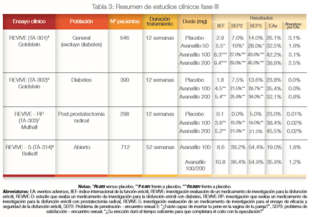 3. Goldstein I, Jones LA, Belkoff LH, Karlin GS, Bowden CH, Peterson CA, et al. Avanafil for the Treatment of Erectile Dysfunction: A Multicenter, Randomized, Double-Blind Study in Men With Diabetes Mellitus. Mayo Clin Proc. septiembre de 2012;87(9):843-52.
