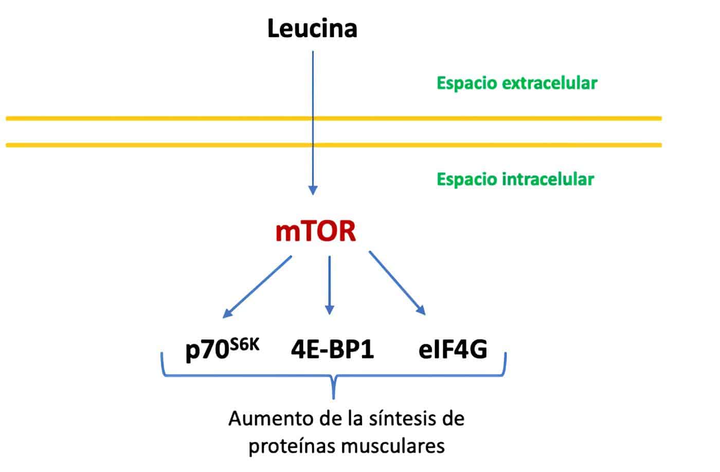 Se ha demostrado que la leucina tiene la capacidad de ingresar de forma directa a la célula y activar, de una manera rápida y efectiva, la vía del mammalian target of rapamycin (mTOR), lo que promueve la activación de ciertos factores intracelulares encargados de la síntesis de las proteínas musculares (FIGURA 2) (3).