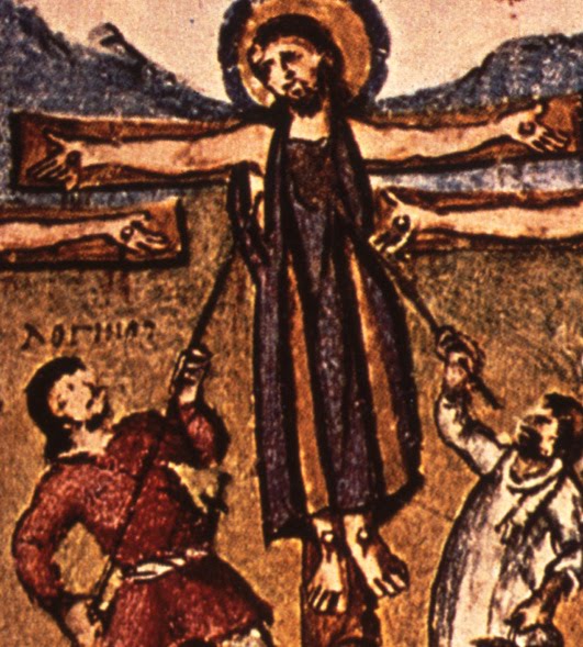- Crucifixion Scene, Rabbula Gospels (c.586). This rare work of Biblical art is the first known depiction in an illuminated manuscript of the crucifixion of Christ. Arte Carolingio de influencia siriaca.