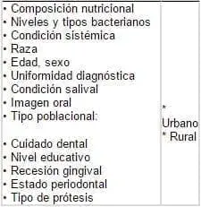 Se hace revisión de la literatura sobre las características determinantes de caries radicular Tabla 2. Se revisan 23 estudios clínicos efectuados, 7 en Estados Unidos, 15 en Canadá y 15 en Europa, en pacientes con un promedio de edad de 71,3 años y se evalúan de acuerdo con: