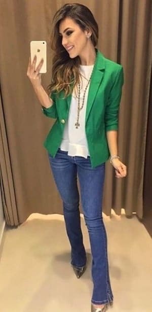 Por ejemplo, imagina un look con una blusa blanca, encima un blazer verde con un jean azul y unos zapatos verdes o blancos, ¡excelente elección! O puede ser al contrario, un pantalón verde oscuro, una camisa blanca y una chaqueta o blazer azul.